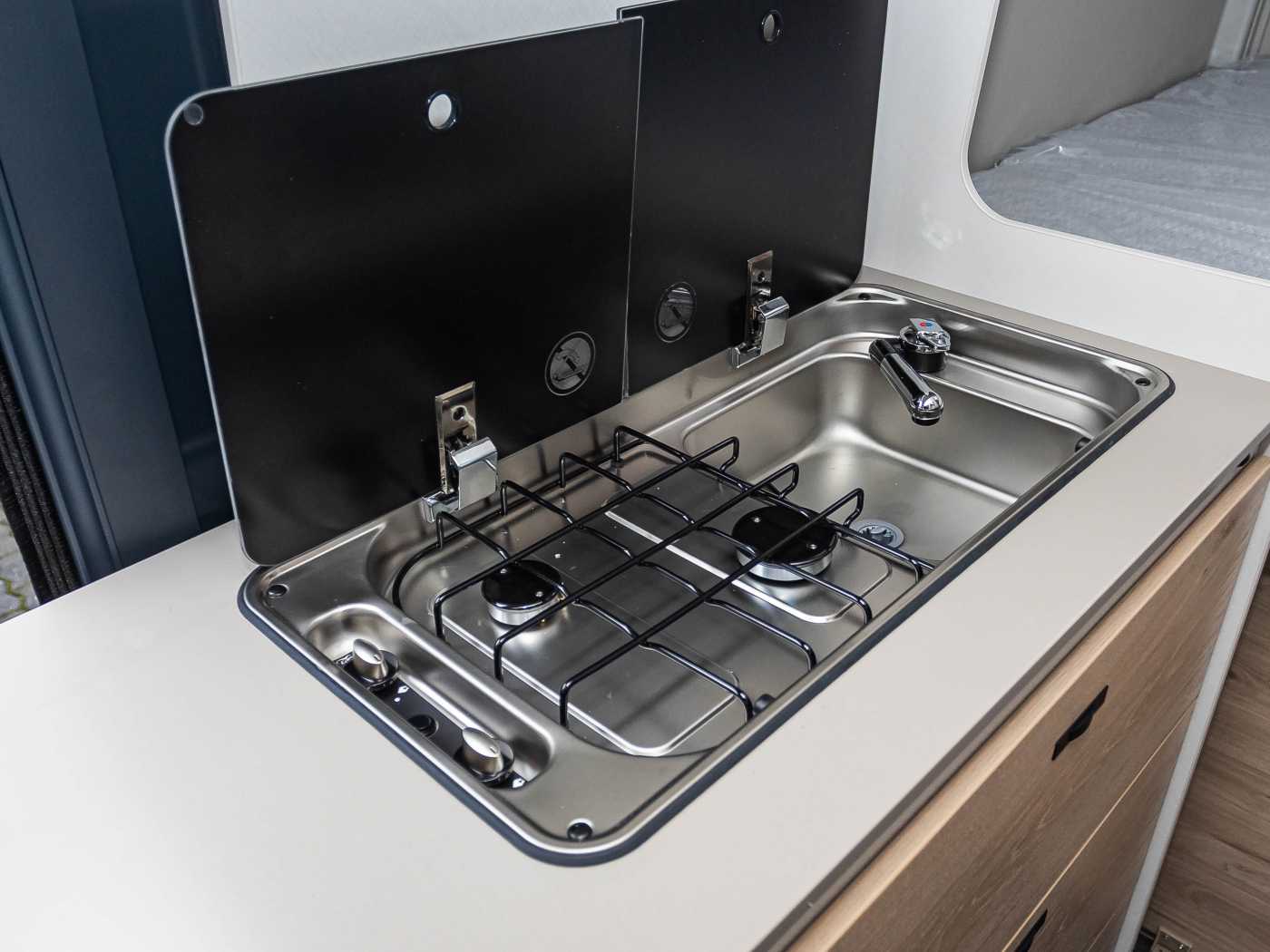 Elektro Paket (Vorzeltleuchte, Zusätzliche Doppel-USB-Steckdose im Bug links, 12-V-Steckdose im Heckbereich links unten, 230-V-Steckdose im Oberschrank Bug links (Sitzgruppe), Indirekte Beleuchtung, LED-Lichtröhre in der Küche, Vorbereitung Solarmodule)