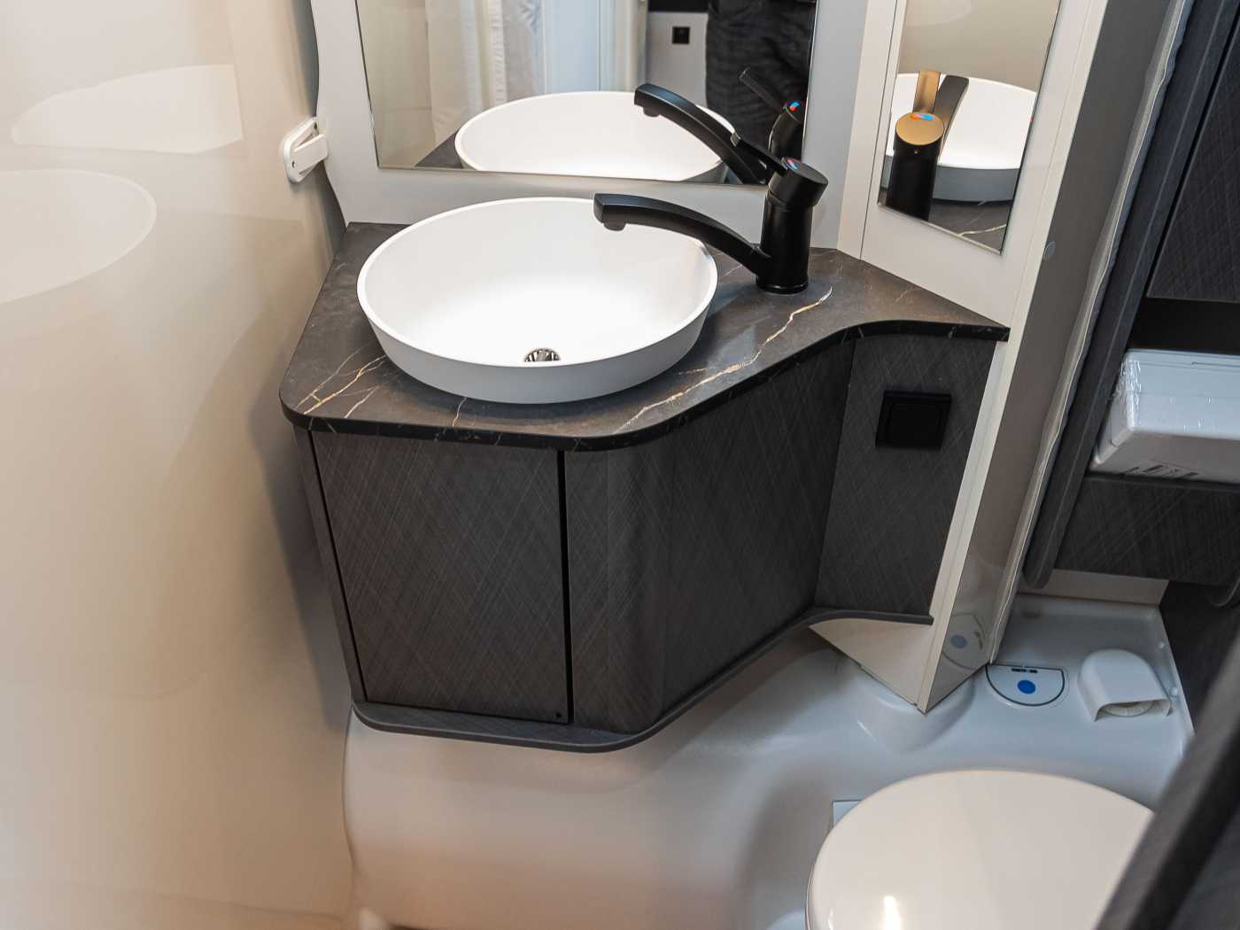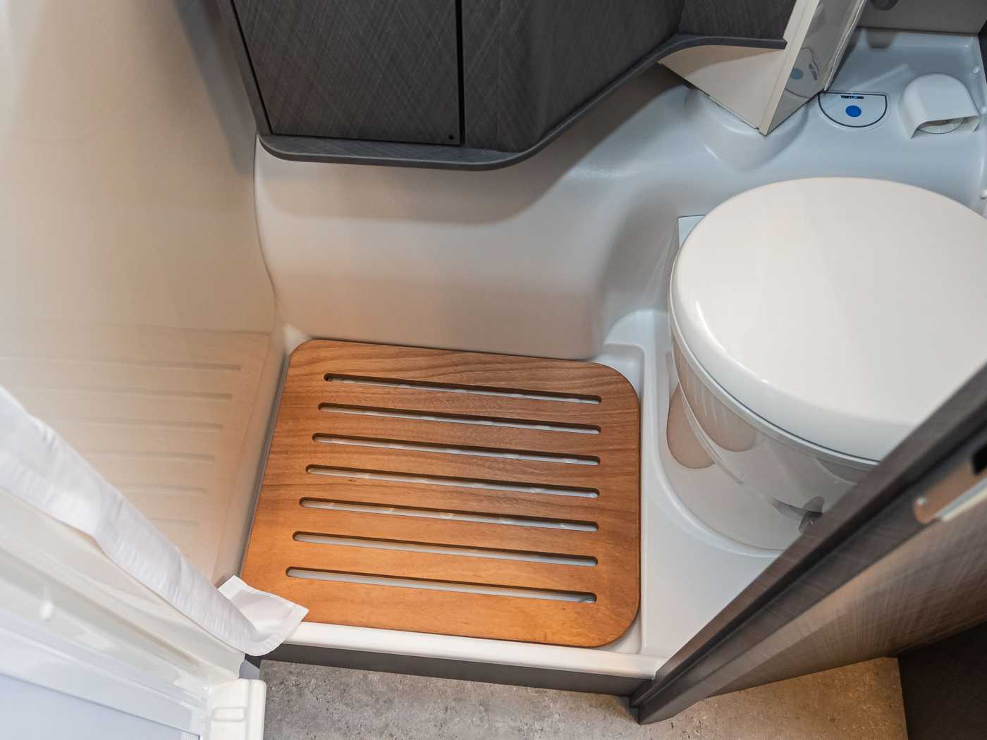 • Variobad • Duschraumverkleidung • Dachhaube mit integriertem Insektenschutzrollo • Große Spiegelflächen • Kleiderstange in der Nasszelle