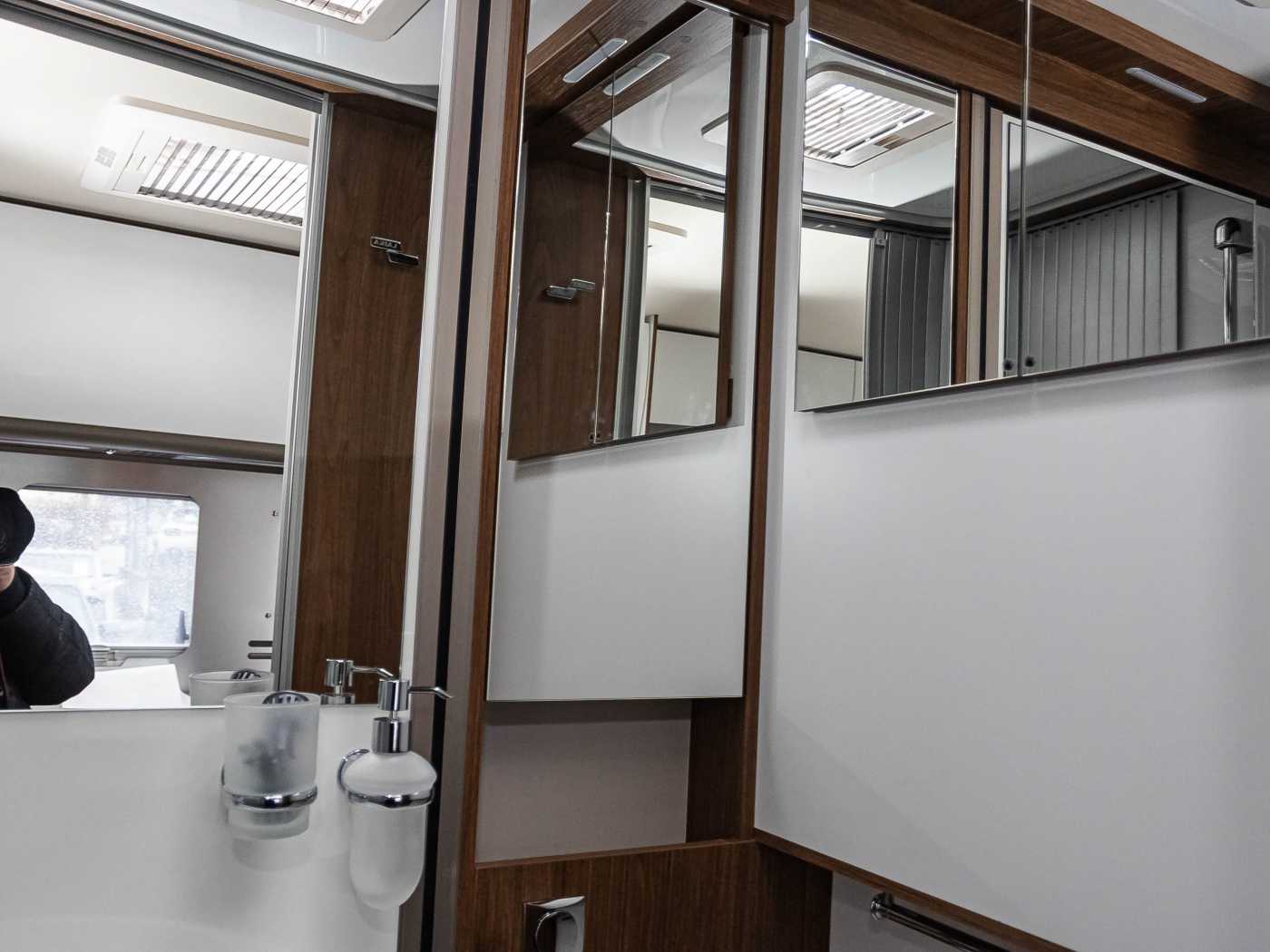 Polyurethan • GFK-Dach • LED-Heckscheinwerfer mit dynamischen Laufblinkern • Doppelboden, beheizt, beleuchtet mit Wärmespeicherfunktion, Beladung von außen und innen, Stauraum und technische Installationen • GFK-Unterboden • Garage mit tiefer Ladefläche, rutschfestem Bodenbelag, beleuchtet, beheizt und Zurrschiene mit variablen Ösen • Garage mit maximaler Nutzlast 250 kg • Steckdose in der Garage • Beidseitige Garagenklappen mit Gasdruckdämpfern und doppelter Schließanlage mit einheitlicher Steuerung • Sensor offene Garagenklappen • Coupé-Einstieg Elektrische Trittstufe • Sensor elektrische Trittstufe mit Bedienung vom Fahrerhaus • Einstiegshilfe • Premium XL-Aufbautür, mit Fernbedienung, Zentralverriegelung, Fenster, Verdunkelung, Ablagefach und Moskitonetz • Rahmenfenster mit Verdunkelung und Moskitonetz